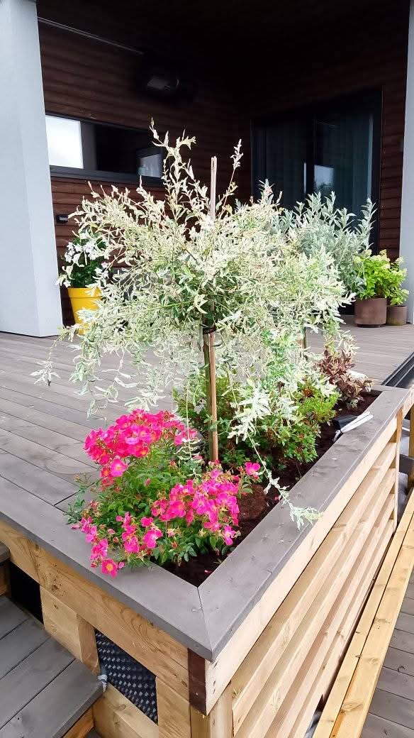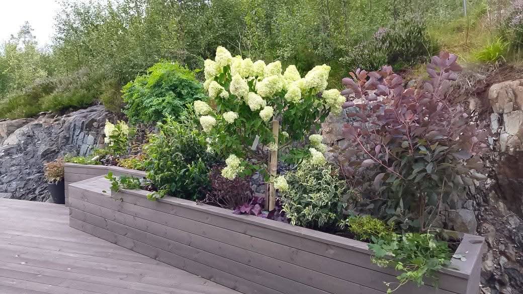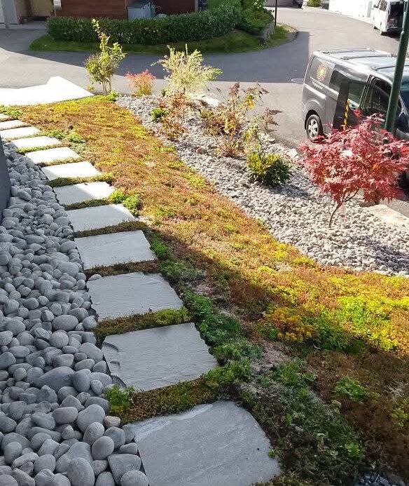 Her har vi levert en hage til et nytt funkishus i Ålesund. Leveransen involverte blant annet å legge sedum. Sedum er et flott produkt som leveres som ferdigskjærte matter klar for legging. En kan også kappe sedumen for å passe til alle typer arealformasjoner i hagen. Den har mange fine og spennende fargevariasjoner. Vi planet også til plantekassene på terrasen med våre flotte planter.